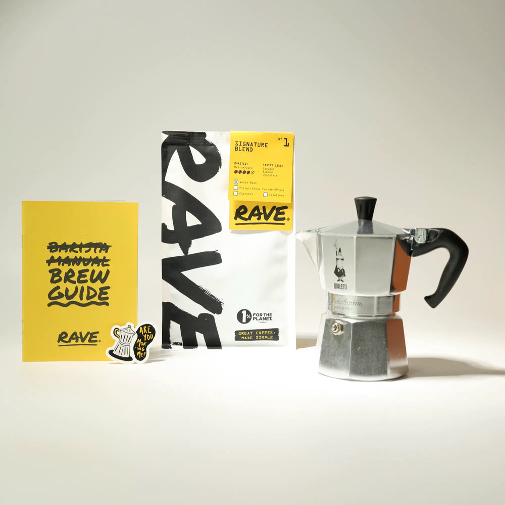 Pairing this beautiful piece of kit with a fresh bag of Rave Coffee will wow anyone who should receive it. This gift gives you the choice of a smaller 3 cup or a larger 6 cup option to fit in perfectly with everyone's coffee needs. It also includes a Rave Brew Guide which will give you guidance on how to get the perfect brew, as well as a new Rave Stove Top Sticker to add to your collection.